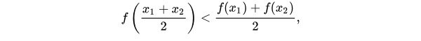 这个定义是直接从几何直观上得来的。如果在曲线弧上面任意取两点,连接这两点的弦总是在弧段的上方,那么曲线就是(向上)凹的,反之也有可类比的结论。取一个特殊的点,即弦的中点,曲线的凹凸性可以用弦的中点与曲线弧上具有相同坐标的点的位置关系来描述。