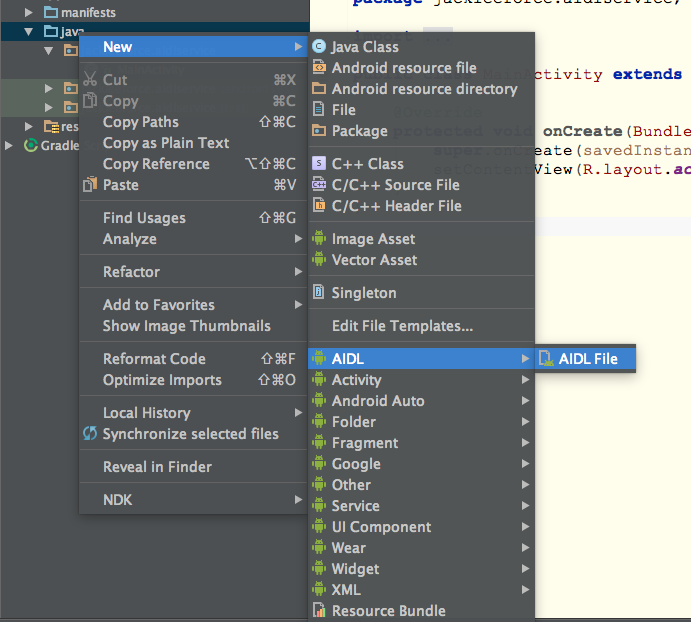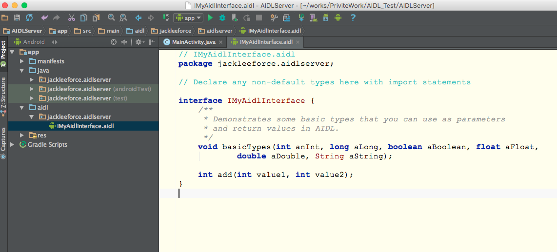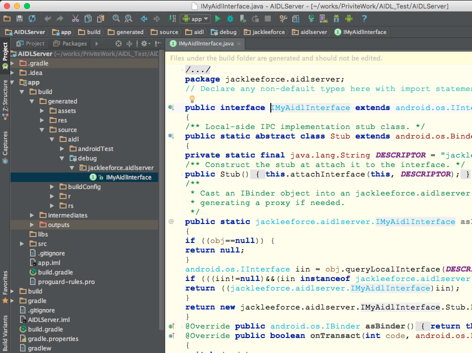 Server端实现 1.建立一个工程,命名:AIDLServer 2.新建AIDL文件,命名:IMyAidlInterface 3.生成后如图2,可以看到自动帮我们生成了一个函数basicTypes,示范了我们可以在AIDL里面使用的基本数据类型,这些类型可以当做参数或者函数返回值,这个函数我们没用到,不用理会,我们新增一个自己的函数add,AIDL文件创建到此结束。 4.我们前面提到过,ADT和AS会自动为我们写的AIDL文件生成JAVA代码,这篇文章里面我用的AS,我们点击 ,然后在app/build/generated/source/aidl/debug/包名下可以看到自动生成的IMyAidlInterface.java,不过实际上这个文件我们不会去动它。如图3: 5.创建Service提供服务,AIDL涉及到IPC通信,所以需要使用绑定服务,在这里我们创建了一个内部类MyAidlImpl继承我们前面写的IMyAidlInterface,并实现了add函数,然后在onBind函数里面返回匿名MyAidlImpl实例。